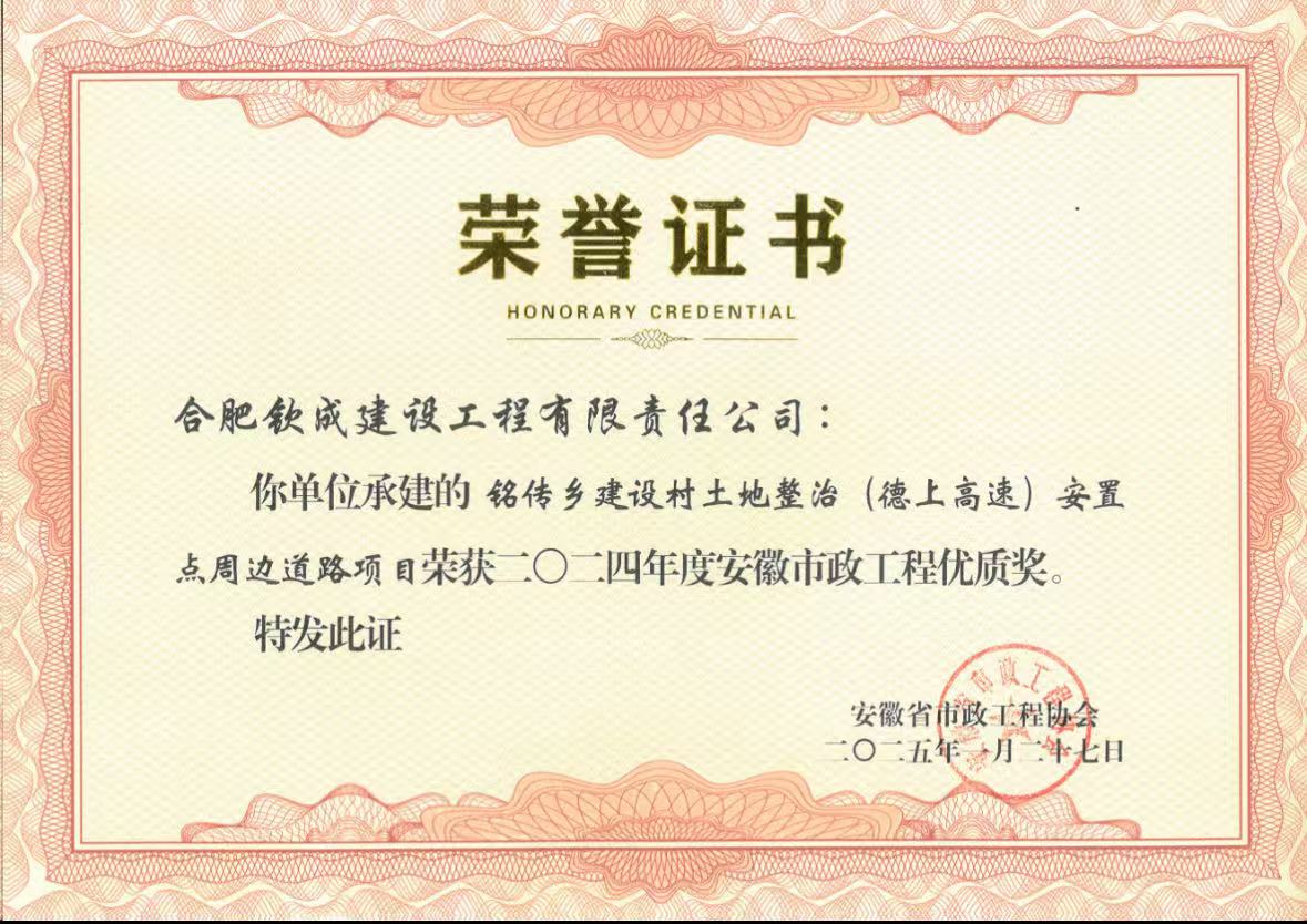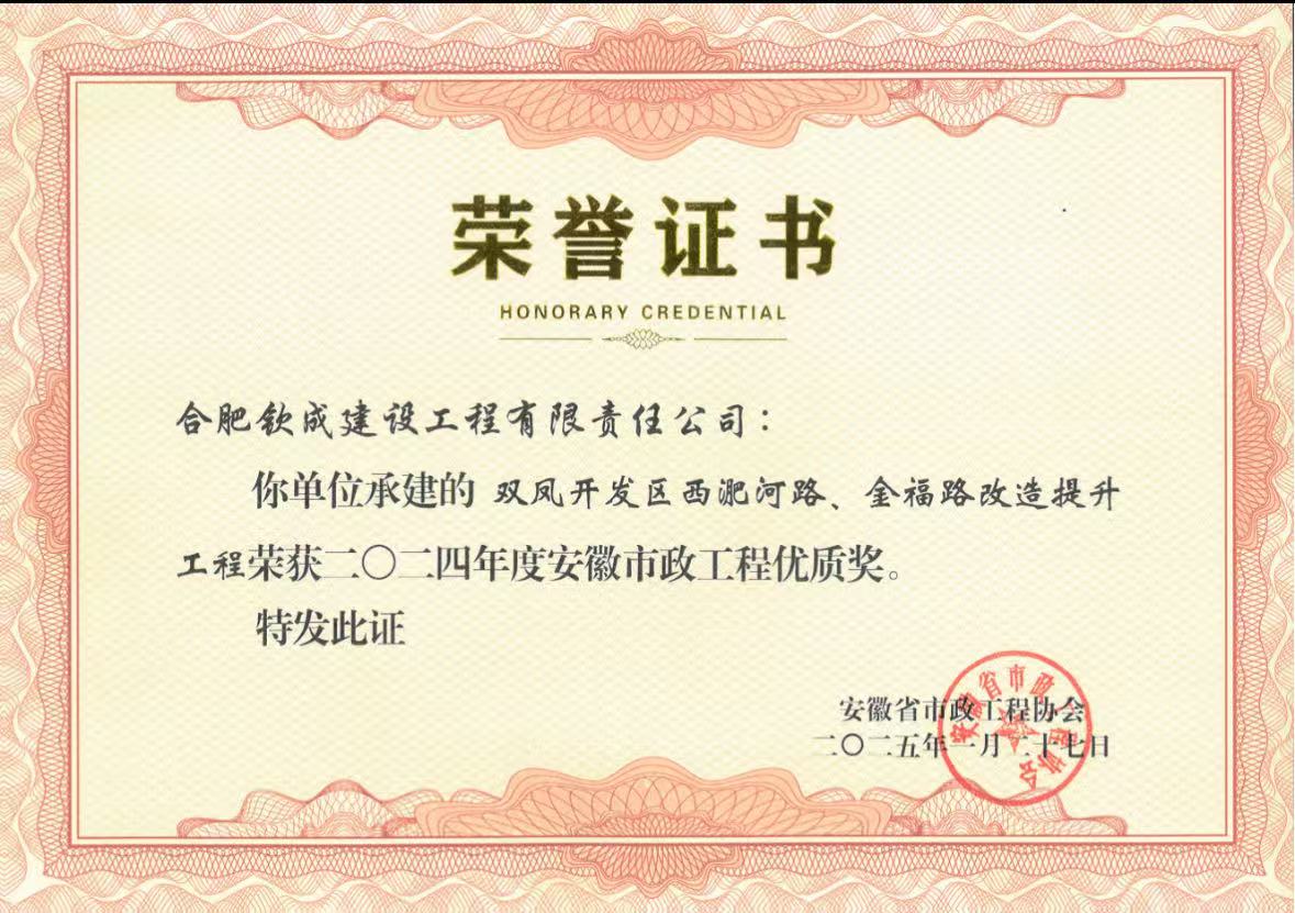 2025年1月27日,安徽省市政工程協(xié)會發(fā)布文件《關(guān)于公布2024年度安徽市政工程優(yōu)質(zhì)獎評選結(jié)果的通知》,由欽成路橋承建的“銘傳鄉(xiāng)建設(shè)村土地整治(德上高速)安置點周邊道路項目”“雙鳳開發(fā)區(qū)西淝河路、金福路改造提升工程”“瑤海區(qū)通達路排水提標(biāo)改造、藍天公寓片區(qū)積澇點整治、恒通片區(qū)內(nèi)澇治理工程”繼“廬州杯”后,又榮獲我省市政工程領(lǐng)域最高榮譽——“安徽市政工程優(yōu)質(zhì)獎”。