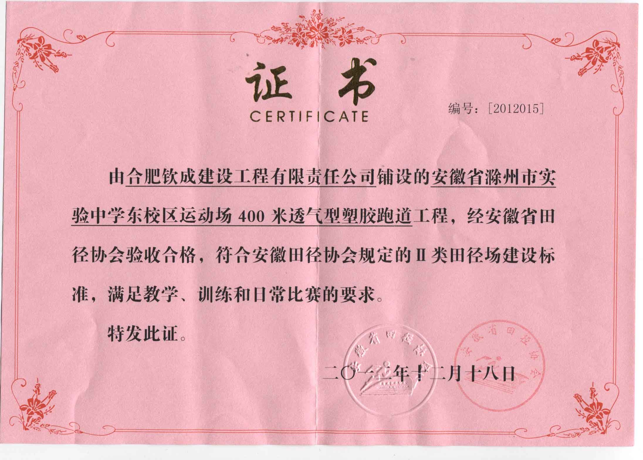 BQ-0-2012年度滁州實驗中學田徑場地驗收合格證書