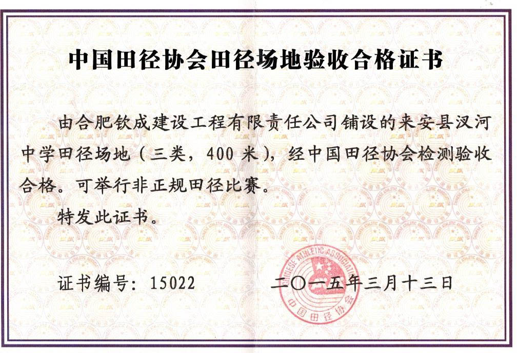 AQ-3-來安縣汊河中學田徑場地檢測驗收合格證