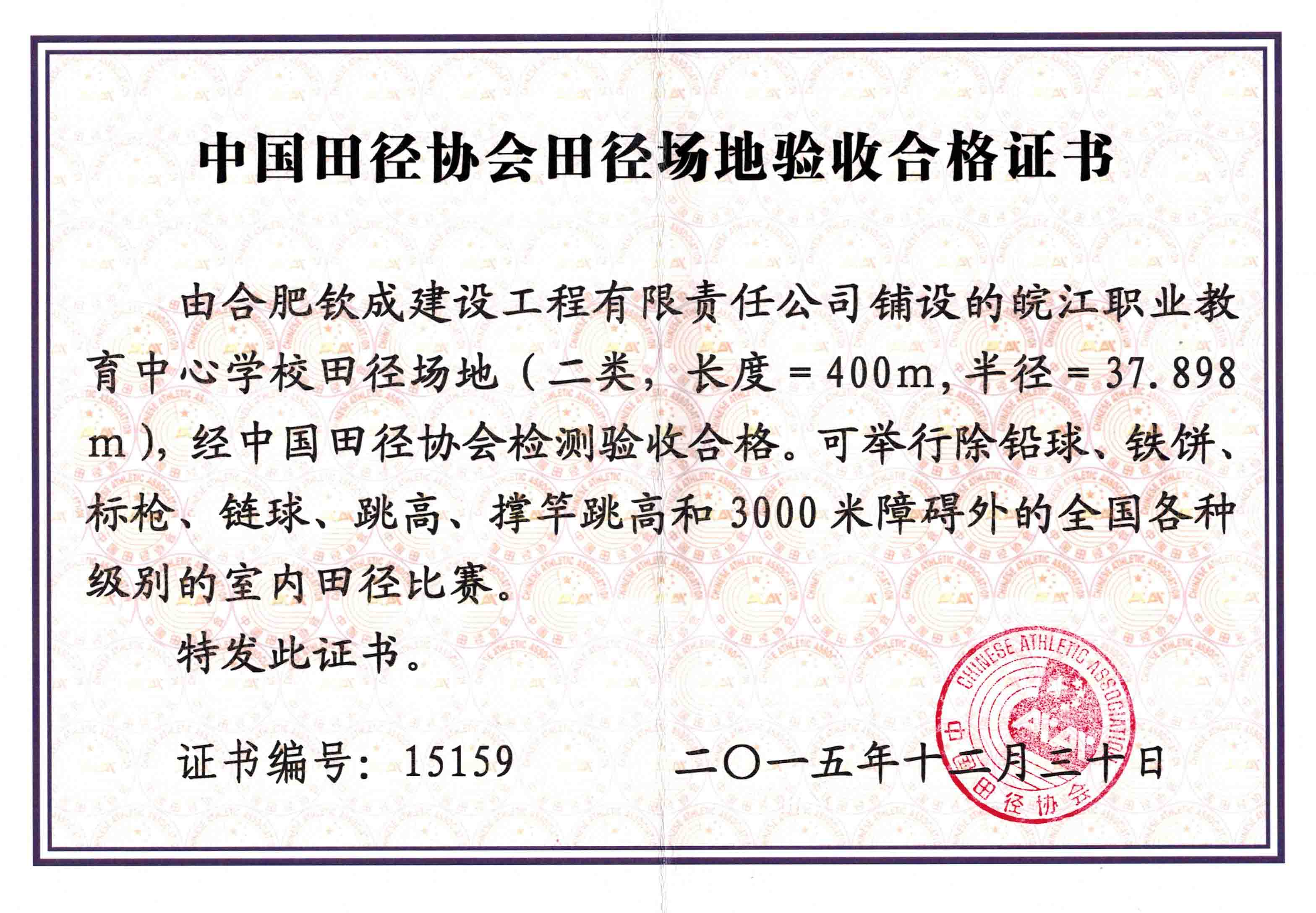 AQ-2-中國田徑協(xié)會田徑場地驗收合格證書(皖江職業(yè)教育中心)